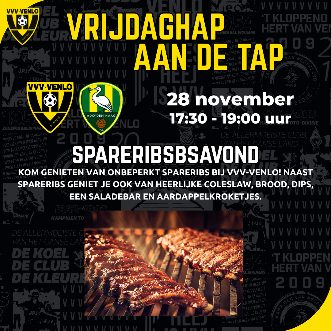 De Hap aan de tap houdt in dat je onbeperkt mag eten van ons overheerlijke buffet. Voorafgaand aan de wedstrijd VVV-Venlo – ADO Den Haag zal dit buffet bestaan uit onbeperkt spareribs eten. Dit alles is verkrijgbaar voor €24,- per persoon. Naast het eten heb je nog de optie om voor €12,50 onbeperkt te drinken (bier, wijn, fris, koffie/thee). Dat betekent dat je voor in totaal €36,50 gedurende anderhalf uur onbeperkt kunt eten en drinken!