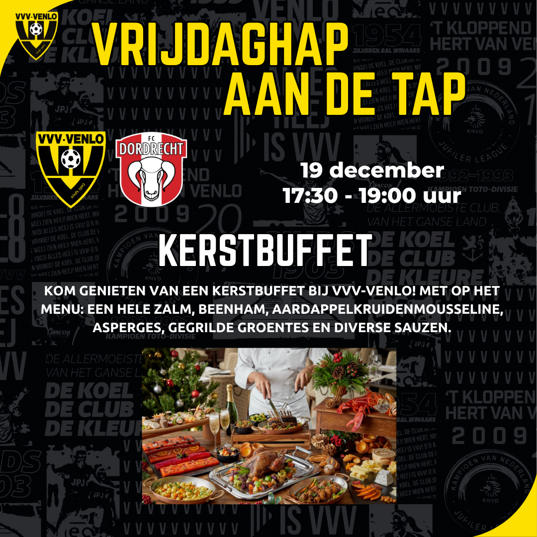 De Hap aan de tap houdt in dat je onbeperkt mag eten van ons overheerlijke buffet. Voorafgaand aan de wedstrijd VVV-Venlo – FC Dordrecht zal dit buffet bestaan uit een kerstbuffet. Dit alles is verkrijgbaar voor €24,- per persoon. Naast het eten heb je nog de optie om voor €12,50 onbeperkt te drinken (bier, wijn, fris, koffie/thee). Dat betekent dat je voor in totaal €36,50 gedurende anderhalf uur onbeperkt kunt eten en drinken!