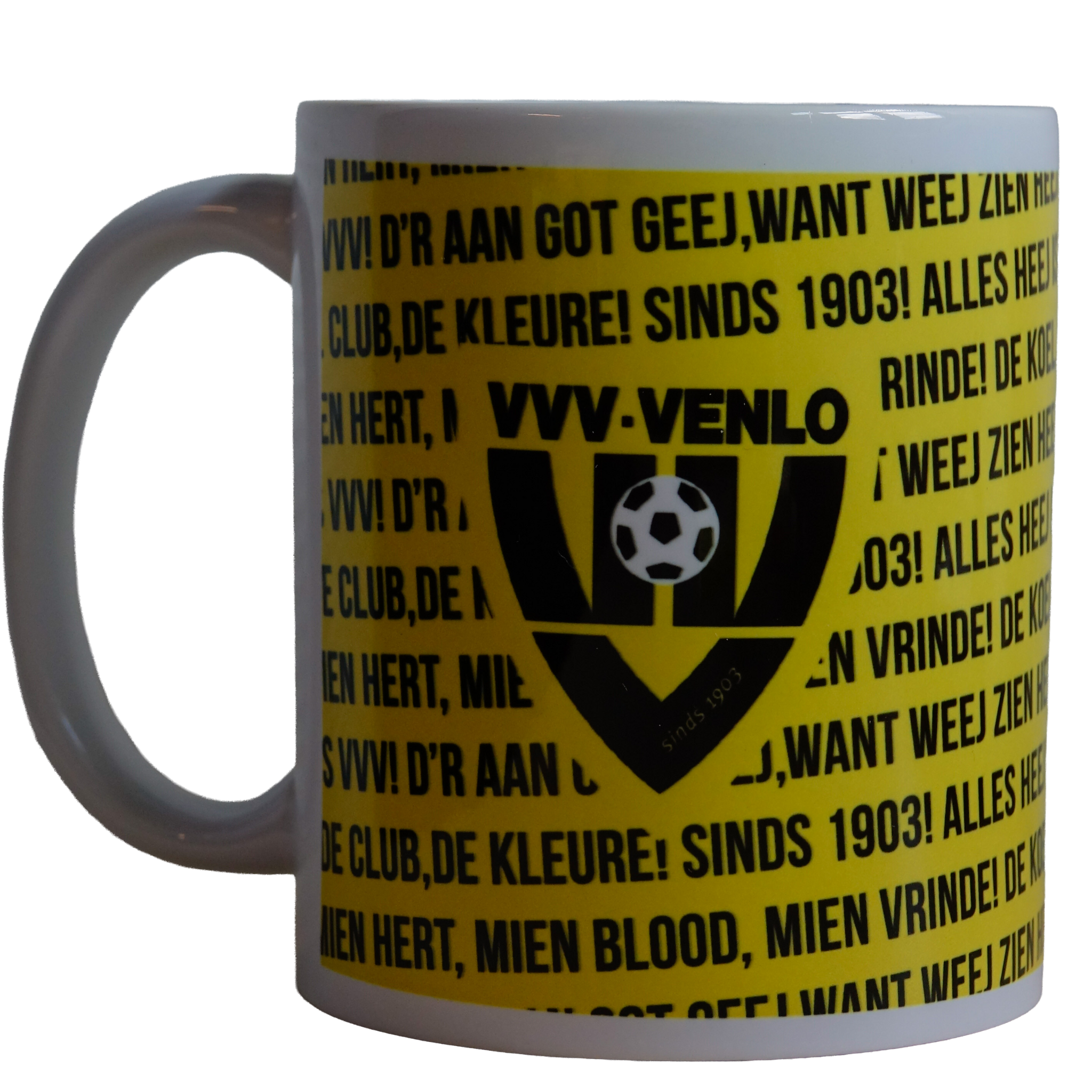 Met deze VVV-Venlo mok smaakt elke koffie of thee nét wat beter. Uitgevoerd in onze herkenbare geel-zwarte kleuren en voorzien van het clublogo. Perfect voor thuis, op kantoor of tijdens de rust van de wedstrijd.