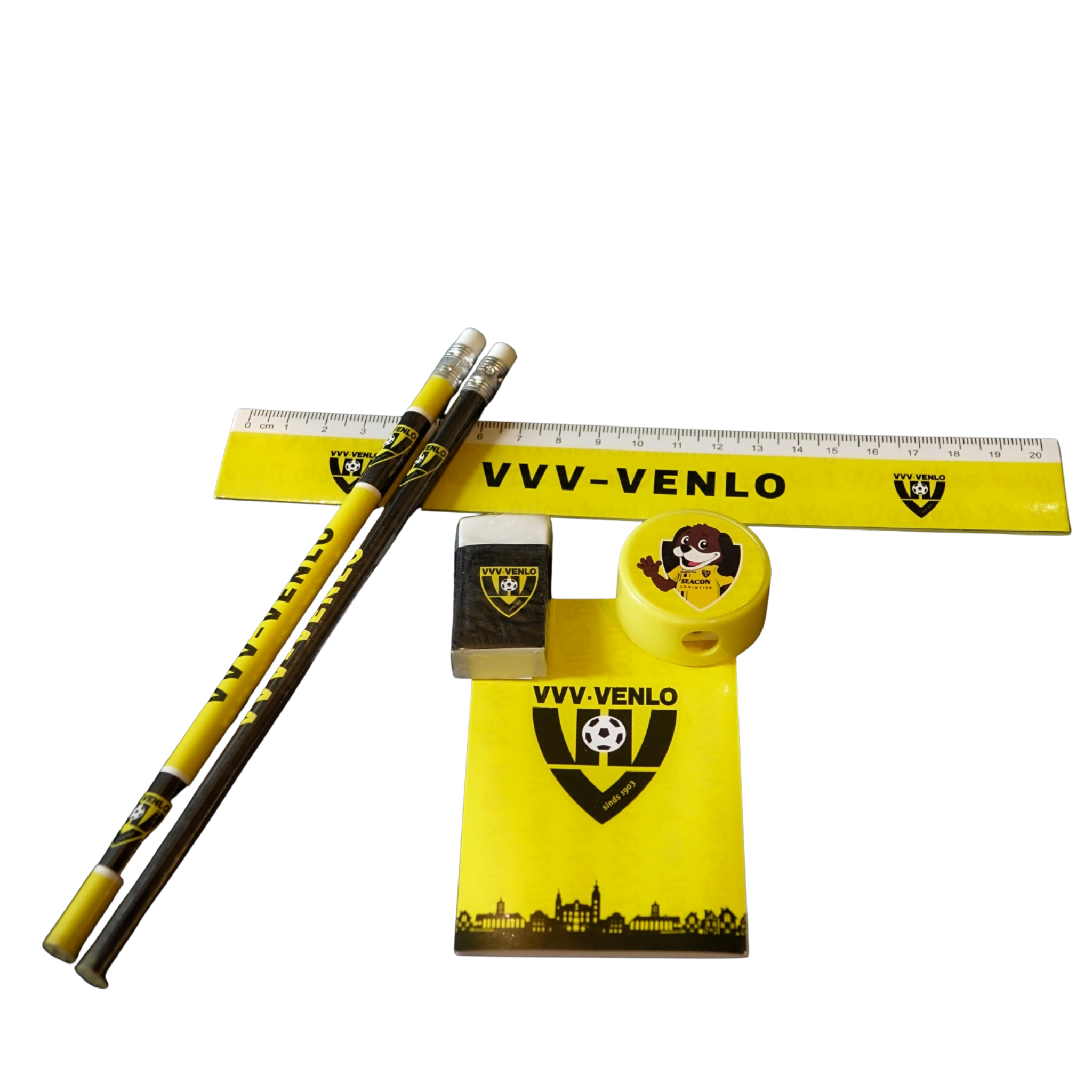 De set bevat 2 potloden, een gum, puntenslijper, liniaal van 20 cm en een notitieboekje.